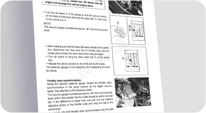 5-28 FUEL SYSTEM AND THROTTLE BODY • Connect a tachometer. • Start up the engine and keep it running at 1 150 r/min by turn- ing throttle stop screw 3. Avoid dirt drown into the throttle body while running the engine without air cleaner box. Dirt drawn into the engine will damage the internal engine parts. • Turn the air screw 4 of the gauge so that the vacuum acting on the tube of that hose will bring the steel ball 5 in the tube to the center line 6. NOTE: The vacuum gauge is positioned approx. 30° from the horizontal level. • After making sure that the steel ball stays steady at the center E line, disconnect the hose from the #1 throttle body vacuum nipple and connect the next hose to this vacuum nipple. L • Turn air screw to bring the other steel ball 7 to the center line. P • Repeat the above process on the third and fourth hoses. M The balancer gauge is now ready for use in balancing the throt- tle valves. SA Throttle valve synchronization Using the vacuum balancer gauge, inspect the throttle valve synchronization in the same manner as the digital vacuum tester. Pay attention to the following points: The vacuum gauge is positioned approx. 30° from the horizontal level, and in this position the four balls should be within one ball 30˚ dia. If the difference is larger than one ball, turn the balance adjusting screw on the throttle body and bring the ball to the same level. A correctly adjusted throttle valve synchronization has the balls in the #1 through #4 at the same level. 09913-13121: Vacuum balancer gauge NOTE: * During balancing the throttle valves, always set the engine rpm at 1 150 r/min, using throttle stop screw. * After balancing the four valves, set the idle rpm to 1 150 r/min by the throttle stop screw.