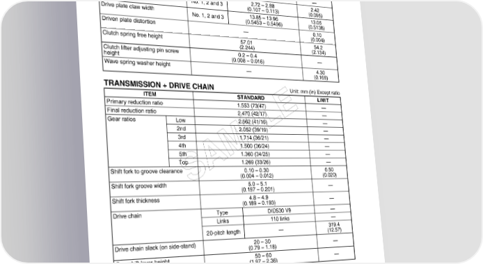 10-52 SERVICING INFORMATION CLUTCH Unit: mm (in) ITEM STANDARD LIMIT Clutch lever play 10 – 15 — (0.4 – 0.6) Clutch release screw 1/2 turn back — Drive plate thickness No. 1, 2 and 3 2.72 – 2.88 2.42 (0.107 – 0.113) (0.095) Drive plate claw width No. 1, 2 and 3 13.85 – 13.96 13.05 (0.5453 – 0.5496) (0.5138) Driven plate distortion — 0.10 (0.004) Clutch spring free height 57.01 54.2 (2.244) (2.134) Clutch lifter adjusting pin screw 0.2 – 0.4 — height (0.008 – 0.016) Wave spring washer height — 4.30 (0.169) TRANSMISSION + DRIVE CHAIN Unit: mm (in) Except ratio ITEM STANDARD LIMIT Primary reduction ratio 1.553 (73/47) — Final reduction ratio 2.470 (42/17) E — Gear ratios Low 2.562 (41/16) — L 2nd 2.052 (39/19) — 3rd 1.714 (36/21) — P 4th 1.500 (36/24) — 5th 1.360 (34/25) — M Top A 1.269 (33/26) — Shift fork to groove clearance 0.10 – 0.30 0.50 S (0.004 – 0.012) (0.020) Shift fork groove width 5.0 – 5.1 — (0.197 – 0.201) Shift fork thickness 4.8 – 4.9 — (0.189 – 0.193) Drive chain Type DID530 V9 — Links 110 links — 20-pitch length — 319.4 (12.57) Drive chain slack (on side-stand) 20 – 30 — (0.79 – 1.18) Gearshift lever height 50 – 60 — (1.97 – 2.36)