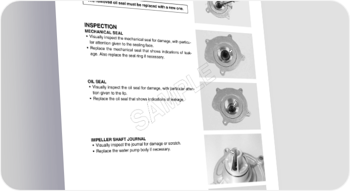 COOLING AND LUBRICATION SYSTEM 7-13 • Remove the oil seal using a suitable bar. NOTE: If there is no abnormal condition, the oil seal removal is not nec- essary. The removed oil seal must be replaced with a new one. INSPECTION MECHANICAL SEAL • Visually inspect the mechanical seal for damage, with particu- lar attention given to the sealing face. • Replace the mechanical seal that shows indications of leak- age. Also replace the seal ring if necessary. OIL SEAL E • Visually inspect the oil seal for damage, with particular atten- tion given to the lip. L • Replace the oil seal that shows indications of leakage. P M A S IMPELLER SHAFT JOURNAL • Visually inspect the journal for damage or scratch. • Replace the water pump body if necessary. SEAL WASHER • Visually inspect the seal washer for damage, with particular attention given to the sealing face. • Replace the seal washer that shows indications of leakage.