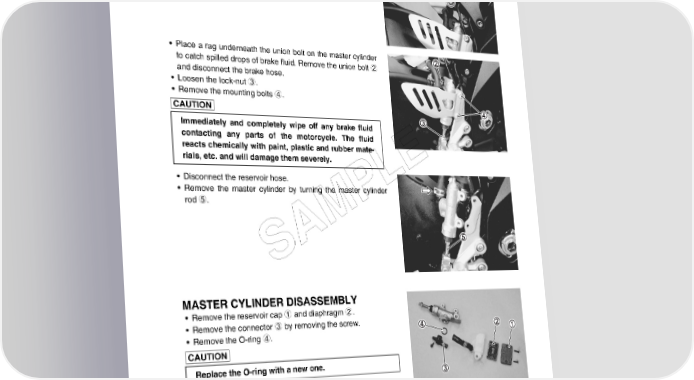 CHASSIS 8-79 MASTER CYLINDER REMOVAL • Drain the brake fluid. (8-64) • Remove the brake fluid reservoir mounting bolt 1. • Place a rag underneath the union bolt on the master cylinder to catch spilled drops of brake fluid. Remove the union bolt 2 and disconnect the brake hose. • Loosen the lock-nut 3. • Remove the mounting bolts 4. Immediately and completely wipe off any brake fluid contacting any parts of the motorcycle. The fluid reacts chemically with paint, plastic and rubber mate- rials, etc. and will damage them severely. E • Disconnect the reservoir hose. L • Remove the master cylinder by turning the master cylinder rod 5. P M A S MASTER CYLINDER DISASSEMBLY • Remove the reservoir cap 1 and diaphragm 2. • Remove the connector 3 by removing the screw. • Remove the O-ring 4. Replace the O-ring with a new one.