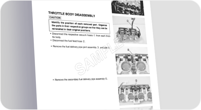 FUEL SYSTEM AND THROTTLE BODY 5-15 • Remove the throttle body assembly. THROTTLE BODY DISASSEMBLY Identify the position of each removed part. Organize the parts in their respective groups so that they can be reinstalled in their original positions. • Disconnect the respective vacuum hoses 1 from each throt- tle body. • Disconnect the fuel feed hose 2. • Remove the fuel delivery pipe joint assembly 3 and plat 4. E L P M A S • Remove the secondary fuel delivery pipe assembly 5. • Remove the primary fuel delivery pipe assembly 6.