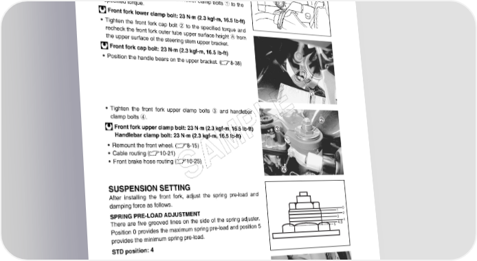 8-26 CHASSIS INSTALLATION Install the front fork in the reverse order of removal. Pay atten- tion to the following points: • Set the upper surface of the outer tube height A at 4.0 mm (0.157 in) from the upper surface of the steering stem upper bracket and tighten the front fork lower clamp bolts 1 to the specified torque. Front fork lower clamp bolt: 23 N·m (2.3 kgf-m, 16.5 lb-ft) • Tighten the front fork cap bolt 2 to the specified torque and recheck the front fork outer tube upper surface height A from the upper surface of the steering stem upper bracket. Front fork cap bolt: 23 N·m (2.3 kgf-m, 16.5 lb-ft) • Position the handle bears on the upper bracket. (8-38) • Tighten the front fork upper clamp bolts 3 and handlebar E clamp bolts 4. L Front fork upper clamp bolt: 23 N·m (2.3 kgf-m, 16.5 lb-ft) Handlebar clamp bolt: 23 N·m (2.3 kgf-m, 16.5 lb-ft) P • Remount the front wheel. (8-15) M • Cable routing (10-21) • Front brake hose routing (10-25) A S SUSPENSION SETTING After installing the front fork, adjust the spring pre-load and damping force as follows. SPRING PRE-LOAD ADJUSTMENT 1 0 There are five grooved lines on the side of the spring adjuster. 2 3 Position 0 provides the maximum spring pre-load and position 5 4.5 4 5 provides the minimum spring pre-load. STD position: 4 DAMPING FORCE ADJUSTMENT Compression damping force Fully turn the damping force adjuster 1 clockwise. It is at stiffest position and turn it out to standard setting position. (For E-02, 19): 6 clicks out from stiffest position (For E-03, 24, 28, 33): 14 clicks out from stiffest position