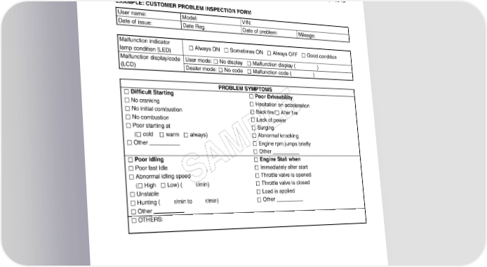 FI SYSTEM DIAGNOSIS 4-23 FI SYSTEM TROUBLESHOOTING CUSTOMER COMPLAINT ANALYSIS Record details of the problem (failure, complaint) and how it occurred as described by the customer. For this purpose, use of such an inspection form such as below will facilitate collecting information required for proper analysis and diagnosis. EXAMPLE: CUSTOMER PROBLEM INSPECTION FORM User name: Model: VIN: Date of issue: Date Reg. Date of problem: Mileage: Malfunction indicator Always ON Sometimes ON Always OFF Good condition lamp condition (LED) Malfunction display/code User mode: No display Malfunction display ( ) (LCD) Dealer mode: No code Malfunction code ( ) PROBLEM SYMPTOMS Difficult Starting Poor Driveability No cranking Hesitation on acceleration No initial combustion Back fire/ After fire E No combustion Lack of power Poor starting at Surging L ( cold warm always) Abnormal knocking P Other Engine rpm jumps briefly Other M Poor Idling Engine Stall when Poor fast Idle A Immediately after start Abnormal idling speedS Throttle valve is opened ( High Low) ( r/min) Throttle valve is closed Unstable Load is applied Hunting ( r/min to r/min) Other Other OTHERS: