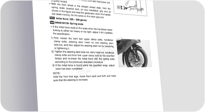 CHASSIS 8-35 STEERING TENSION ADJUSTMENT Check the steering movement in the following procedure. • By supporting the motorcycle with a jack, lift the front wheel until it is off the floor by 20 – 30 mm (0.8 – 1.2 in). • Remove the steering damper. (8-29) • Check to make sure that the cables and wire harnesses are properly routed. • With the front wheel in the straight ahead state, hitch the spring scale (special tool) on one handlebar grip end as shown in the figure and read the graduation when the handle- bar starts moving. Do the same on the other grip end. Initial force: 200 – 500 grams 09940-92720: Spring scale • If the initial force read on the scale when the handlebar starts turning is either too heavy or too light, adjust it till it satisfies the specification. 1) First, loosen the front fork upper clamp bolts, handlebar clamp bolts, steering stem head nut and steering stem lock-nut, and then adjust the steering stem nut by loosening or tightening it. E 2) Tighten the steering stem lock-nut, stem head nut, handlebar L clamp bolts and front fork upper clamp bolts to the specified torque and re-check the initial force with the spring scale P according to the previously described procedure. 3) If the initial force is found within the specified range, adjust- M ment has been completed. A NOTE: Hold the front fork legs, move them back and forth and make S sure that the steering is not loose.