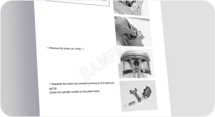 3-26 ENGINE PISTON AND CONROD • Push the conrod to cylinder head side and remove the piston and conrod from the upper crankcase. Be careful not to damage the cylinder wall by the con- rod. • Remove the piston pin circlip 1. E L P M A S • Separate the piston and conrod by driving out the piston pin. NOTE: Scribe the cylinder number on the piston head.