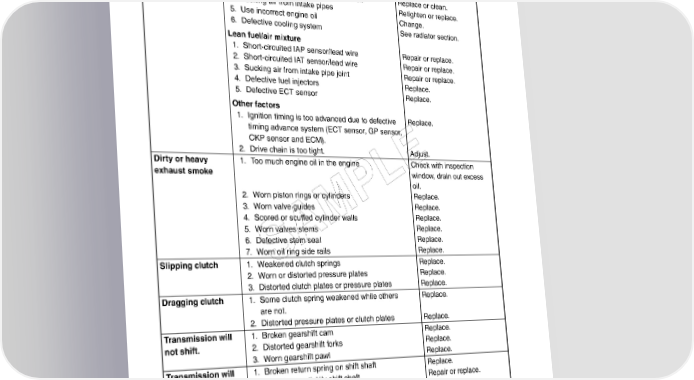 10-12 SERVICING INFORMATION Complaint Symptom and possible causes Remedy Engine overheats Defective engine internal parts 1. Heavy carbon deposit on piston crowns Clean. 2. Not enough oil in the engine Add oil. 3. Defective oil pump or clogged oil circuit Replace or clean. 4. Sucking air from intake pipes Retighten or replace. 5. Use incorrect engine oil Change. 6. Defective cooling system See radiator section. Lean fuel/air mixture 1. Short-circuited IAP sensor/lead wire Repair or replace. 2. Short-circuited IAT sensor/lead wire Repair or replace. 3. Sucking air from intake pipe joint Repair or replace. 4. Defective fuel injectors Replace. 5. Defective ECT sensor Replace. Other factors 1. Ignition timing is too advanced due to defective Replace. timing advance system (ECT sensor, GP sensor, CKP sensor and ECM). 2. Drive chain is too tight. Adjust. Dirty or heavy 1. Too much engine oil in the engine Check with inspection E exhaust smoke Lwindow, drain out excess oil. 2. Worn piston rings or cylinders P Replace. 3. Worn valve guides Replace. 4. Scored or scuffed cylinder walls Replace. 5. Worn valves stems M Replace. 6. Defective stem seal Replace. A 7. Worn oil ring side rails Replace. S Slipping clutch 1. Weakened clutch springs Replace. 2. Worn or distorted pressure plates Replace. 3. Distorted clutch plates or pressure plates Replace. Dragging clutch 1. Some clutch spring weakened while others Replace. are not. 2. Distorted pressure plates or clutch plates Replace. Transmission will 1. Broken gearshift cam Replace. not shift. 2. Distorted gearshift forks Replace. 3. Worn gearshift pawl Replace. Transmission will 1. Broken return spring on shift shaft Replace. not shift back. 2. Rubbing or stickily shift shaft Repair or replace. 3. Distorted or worn gearshift forks Replace. Transmission jumps 1. Worn shifting gears on driveshaft or Replace. out of gear. countershaft 2. Distorted or worn gearshift forks Replace. 3. Weakened stopper spring on gearshift stopper Replace. 4. Worn gearshift cam plate Replace.