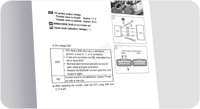FI SYSTEM DIAGNOSIS 4-47 Step 3 1) Connect the TP sensor coupler 1 to the test harness. V 2) Turn the ignition switch ON. 3) Measure the TP sensor output voltage at the coupler (between + P/B and - B/Br) by turning the throttle grip. TP sensor output voltage 3 Throttle valve is closed: Approx. 1.1 V Throttle valve is opened: Approx. 4.3 V 09900-25008: Multi-circuit tester set P/B Tester knob indication: Voltage () TPS R ECM B/Br Is the voltage OK? 3 E • P/B, Red or B/Br wire open or shorted to ECM coupler (Harness side) ground, or poor 8, A or S connection L (Black) (Gray) • If wire and connection are OK, intermittent trou- P YES ble or faulty ECM. • Recheck each terminal and wire harness for M open circuit and poor connection. A • Replace the ECM with a known good one, and inspect it again. S NO If check result is not satisfactory, replace TP sen- sor with a new one. 4) After repairing the trouble, clear the DTC using SDS tool. (4-27)