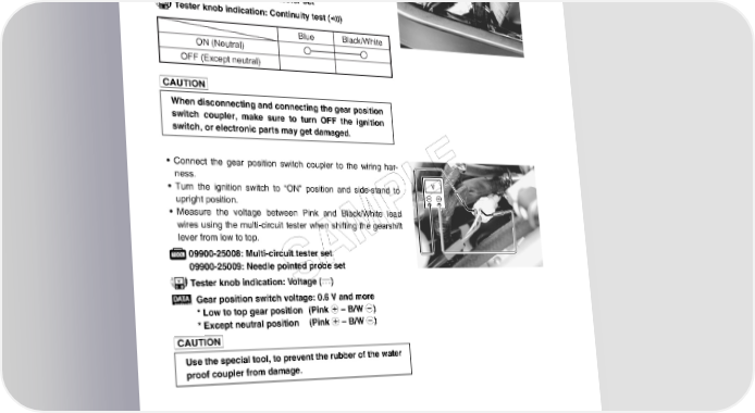 9-18 ELECTRICAL SYSTEM GEAR POSITION SWITCH • Lift and support the fuel tank. (5-3) • Disconnect the gear position switch coupler and check the continuity between Blue and Black/White with the transmis- sion in “NEUTRAL”. 09900-25008: Multi-circuit tester set Tester knob indication: Continuity test () Blue Black/White ON (Neutral) OFF (Except neutral) When disconnecting and connecting the gear position switch coupler, make sure to turn OFF the ignition switch, or electronic parts may get damaged. • Connect the gear position switch coupler to the wiring har- ness. E • Turn the ignition switch to “ON” position and side-stand to V upright position. L • Measure the voltage between Pink and Black/White lead P wires using the multi-circuit tester when shifting the gearshift lever from low to top. M 09900-25008: Multi-circuit tester set A 09900-25009: Needle pointed probe set Tester knob indication: Voltage () S Gear position switch voltage: 0.6 V and more * Low to top gear position (Pink + – B/W -) * Except neutral position (Pink + – B/W -) Use the special tool, to prevent the rubber of the water proof coupler from damage.