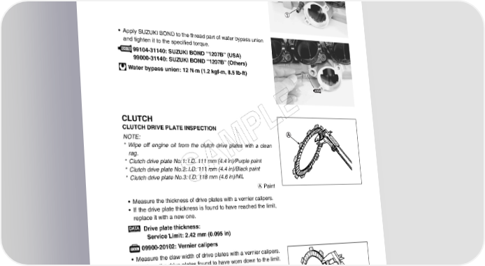 ENGINE 3-43 WATER BYPASS UNION • Remove the water bypass union 1. • Apply SUZUKI BOND to the thread part of water bypass union and tighten it to the specified torque. 99104-31140: SUZUKI BOND “1207B” (USA) 99000-31140: SUZUKI BOND “1207B” (Others) Water bypass union: 12 N·m (1.2 kgf-m, 8.5 lb-ft) CLUTCH E CLUTCH DRIVE PLATE INSPECTION L NOTE: P * Wipe off engine oil from the clutch drive plates with a clean rag. M * Clutch drive plate No.1: I.D. 111 mm (4.4 in)/Purple paint * Clutch drive plate No.2: I.D. 111 mm (4.4 in)/Black paint A * Clutch drive plate No.3: I.D. 118 mm (4.6 in)/NIL S A Paint • Measure the thickness of drive plates with a vernier calipers. • If the drive plate thickness is found to have reached the limit, replace it with a new one. Drive plate thickness: Service Limit: 2.42 mm (0.095 in) 09900-20102: Vernier calipers • Measure the claw width of drive plates with a vernier calipers. • Replace the drive plates found to have worn down to the limit. Drive plate claw width: Service Limit: 13.05 mm (0.5138 in) 09900-20102: Vernier calipers