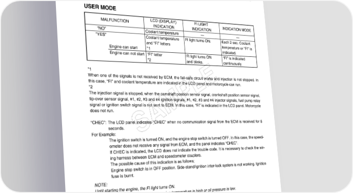 FI SYSTEM DIAGNOSIS 4-17 SELF-DIAGNOSIS FUNCTION The self-diagnosis function is incorporated in the ECM. The function has two modes, “User mode” and “Dealer mode”. The user can only be notified by the LCD (DISPLAY) panel and LED (FI light). To check the function of the individual FI system devices, the dealer mode is provided. In this check, the special tool is necessary to read the code of the malfunction items. USER MODE MALFUNCTION LCD (DISPLAY) FI LIGHT INDICATION MODE INDICATION INDICATION “NO” Coolant temperature ---- ---- “YES” Coolant temperature FI light turns ON. Each 2 sec. Coolant and “FI” letters temperature or “FI” is Engine can start *1 indicated. Engine can not start “FI” letter FI light turns ON “FI” is indicated *2 and blinks. continuously. *1 When one of the signals is not received by ECM, the fail-safe circuit works and injection is not stopped. In this case, “FI” and coolant temperature are indicated in the LCD panel and motorcycle can run. *2 E L The injection signal is stopped, when the camshaft position sensor signal, crankshaft position sensor signal, tip-over sensor signal, #1, #2, #3 and #4 ignition signals, #1, #2, #3 and #4 injector signals, fuel pump relay P signal or ignition switch signal is not sent to ECM. In this case, “FI” is indicated in the LCD panel. Motorcycle does not run. M “CHEC”: The LCD panel indicates “CHEC” when no communication signal from the ECM is received for 5 seconds. A For Example: S The ignition switch is turned ON, and the engine stop switch is turned OFF. In this case, the speed- ometer does not receive any signal from ECM, and the panel indicates “CHEC”. If CHEC is indicated, the LCD does not indicate the trouble code. It is necessary to check the wir- ing harness between ECM and speedometer couplers. The possible cause of this indication is as follows; Engine stop switch is in OFF position. Side-stand/ignition inter-lock system is not working. Ignition fuse is burnt. NOTE: Until starting the engine, the FI light turns ON. The FI light is also turned ON when engine temperature is high or oil pressure is low.