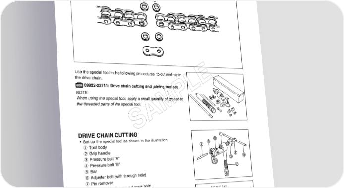8-86 CHASSIS DRIVE CHAIN Use the special tool in the following procedures, to cut and rejoin the drive chain. E 09922-22711: Drive chain cutting and joining tool set L NOTE: When using the special tool, apply a small quantity of grease to P the threaded parts of the special tool. AM S DRIVE CHAIN CUTTING • Set up the special tool as shown in the illustration. 1Tool body 2Grip handle 3Pressure bolt “A” 4Pressure bolt “B” 5Bar 6Adjuster bolt (with through hole) 7Pin remover 8Chain holder (engraved mark 500) with reamer bolt M5 × 10 5 mm (0.2 in) NOTE: The tip of pin remover 7 should be positioned inside approxi- mately 5 mm (0.2 in) from the end face of pressure bolt “A” 3 as shown in the illustration.