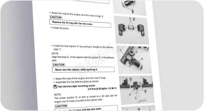 FUEL SYSTEM AND THROTTLE BODY 5-19 • Apply thin coat of the engine oil to the new O-ring 3 and cusion seal 4. Replace the cushion seal and O-ring with the new ones. • Apply thin coat of the engine oil to the new O-rings 5. Replace the O-ring with the new ones. • Install the joints. • Install the fuel injector 6 by pushing it straight to the delivery E pipe 7. L NOTE: Align the boss E of the injector with the groove F of the delivery pipe. P M Never turn the injector while pushing it. A S • Apply thin coat of the engine oil to the new O-rings. #2#2#2 #2#2#3 • Assemble the fuel delivery pipes as shown. Fuel delivery pipe mounting screw: 3.5 N·m (0.35 kgf-m, 2.5 lb-ft) NOTE: The screw section G of joint is turned to a #2 side and the longer one H body is turned to the injector side. * Replace the O-rings with the new ones. * Never turn the fuel delivery pipes while pushing it. #2#2#2 #2#3#2
