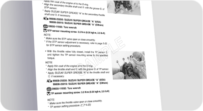 5-18 FUEL SYSTEM AND THROTTLE BODY THROTTLE BODY REASSEMBLY Reassemble the throttle body in the reverse order of disassem- bly. Pay attention to the following points: • With the STV fully open, install the STP sensor 1 and tighten the STP sensor mounting screw to the specified torque. NOTE: * Apply thin coat of the engine oil to the O-ring. * Align the secondary throttle shaft end A with the groove B of STP sensor. * Apply SUZUKI SUPER GREASE “A” to the secondary throttle shaft end A if necessary. 99000-25030: SUZUKI SUPER GREASE “A” (USA) 99000-25010: SUZUKI SUPER GREASE “A” (Others) 09930-11950: Torx wrench STP sensor mounting screw: 3.5 N·m (0.35 kgf-m, 2.5 lb-ft) NOTE: * Make sure the STP valve open or close smoothly. * If the STP sensor adjustment is necessary, refer to page 5-22 for STP sensor setting procedure. E • With the throttle valve fully closed, install the TP sensor 2 L and tighten the TP sensor mounting screw to the specified torque. P NOTE: M * Apply thin coat of the engine oil to the O-ring. * Align the throttle shaft end C with the groove D of TP sensor. A * Apply SUZUKI SUPER GREASE “A” to the throttle shaft end C if necessary. S 99000-25030: SUZUKI SUPER GREASE “A” (USA) 99000-25010: SUZUKI SUPER GREASE “A” (Others) 09930-11950: Torx wrench TP sensor mounting screw: 3.5 N·m (0.35 kgf-m, 2.5 lb-ft) NOTE: * Make sure the throttle valve open or close smoothly. * TP sensor setting procedure. (4-20)