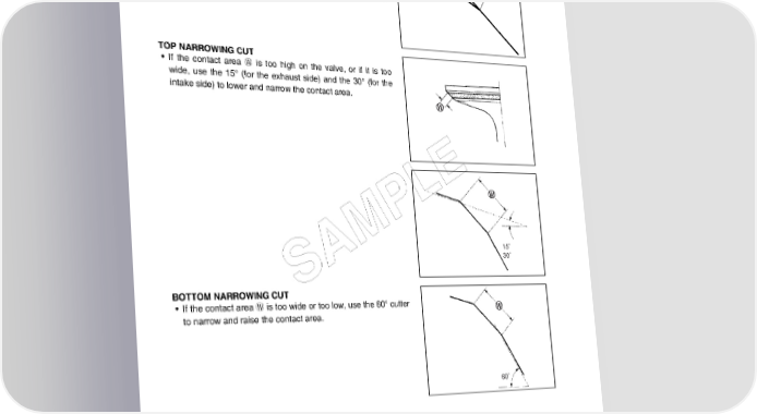 3-38 ENGINE • If the valve seat is pitted or burned, use the 45° cutter to con- dition the seat some more. NOTE: Cut only the minimum amount necessary from the seat to pre- vent the possibility of the valve stem becoming too close to the camshaft. TOP NARROWING CUT • If the contact area W is too high on the valve, or if it is too wide, use the 15° (for the exhaust side) and the 30° (for the intake side) to lower and narrow the contact area. E PL M 15˚ SA 30˚ BOTTOM NARROWING CUT • If the contact area W is too wide or too low, use the 60° cutter to narrow and raise the contact area. 60˚