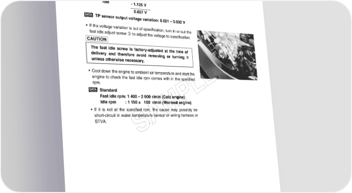FUEL SYSTEM AND THROTTLE BODY 5-25 • Calculate the voltage difference between TP sensor output voltage at idle and TP sensor output voltage with the STV full opened. Example:TP sensor output voltage with the STV fully open Minus TP sensor output voltage at idle is 0.027 V STV fully open 1.152 V Idle - 1.125 V 0.027 V TP sensor output voltage variation: 0.021 – 0.032 V • If the voltage variation is out of specification, turn in or out the fast idle adjust screw 3 to adjust the voltage to specification. The fast idle screw is factory-adjusted at the time of delivery and therefore avoid removing or turning it unless otherwise necessary. • Cool down the engine to ambient air temperature and start the engine to check the fast idle rpm comes with in the specified rpm. E Standard L Fast idle rpm: 1 400 – 2 000 r/min (Cold engine) P Idle rpm : 1 150 ± 100 r/min (Warmed engine) • If it is not at the specified rpm, the cause may possibly be M short-circuit in water temperature sensor or wiring harness or STVA. A S