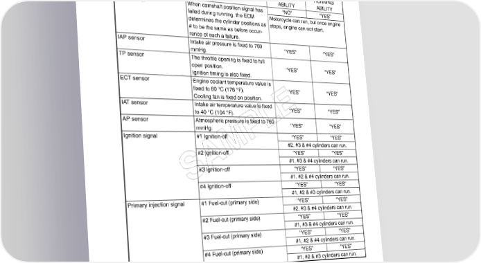 FI SYSTEM DIAGNOSIS 4-21 FAIL-SAFE FUNCTION FI system is provided with fail-safe function to allow the engine to start and the motorcycle to run in a mini- mum performance necessary even under malfunction condition. ITEM FAIL-SAFE MODE STARTING RUNNING ABILITY ABILITY CMP sensor When camshaft position signal has “NO” “YES” failed during running, the ECM Motorcycle can run, but once engine determines the cylinder positions as stops, engine can not start. # to be the same as before occur- rence of such a failure. IAP sensor Intake air pressure is fixed to 760 “YES” “YES” mmHg. TP sensor The throttle opening is fixed to full open position. “YES” “YES” Ignition timing is also fixed. ECT sensor Engine coolant temperature value is fixed to 80 °C (176 °F). “YES” “YES” Cooling fan is fixed on position. IAT sensor Intake air temperature value is fixed “YES” “YES” to 40 °C (104 °F). E AP sensor Atmospheric pressure is fixed to 760 “YES” “YES” mmHg. L Ignition signal #1 Ignition-off P “YES” “YES” #2, #3 & #4 cylinders can run. #2 Ignition-off “YES” “YES” M A #1, #3 & #4 cylinders can run. #3 Ignition-off “YES” “YES” S #1, #2 & #4 cylinders can run. #4 Ignition-off “YES” “YES” #1, #2 & #3 cylinders can run. Primary injection signal #1 Fuel-cut (primary side) “YES” “YES” #2, #3 & #4 cylinders can run. #2 Fuel-cut (primary side) “YES” “YES” #1, #3 & #4 cylinders can run. #3 Fuel-cut (primary side) “YES” “YES” #1, #2 & #4 cylinders can run. #4 Fuel-cut (primary side) “YES” “YES” #1, #2 & #3 cylinders can run.
