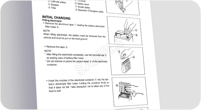 9-40 ELECTRICAL SYSTEM BATTERY SPECIFICATIONS Type designation FT12A-BS Capacity 12 V, 36 kC (10 Ah)/10 HR 1 Upper cover breather 5 Terminal 2 Cathode plates 6 Safety valve 3 Stopper 7 Anode plates 4 Filter 8 Separator (Fiberglass plate) INITIAL CHARGING Filling electrolyte • Remove the aluminum tape 1 sealing the battery electrolyte filler holes A. NOTE: When filling electrolyte, the battery must be removed from the vehicle and must be put on the level ground. • Remove the caps 2. E NOTE: L * After filling the electrolyte completely, use the removed cap 2 as sealing caps of battery-filler holes. P * Do not remove or pierce the sealed areas 3 of the electrolyte container. M A S • Insert the nozzles of the electrolyte container 4 into the bat- tery’s electrolyte filler holes, holding the container firmly so that it does not fall. Take precaution not to allow any of the fluid to spill. • Make sure air bubbles 5 are coming up each electrolyte con- tainer, and leave in this position for about more than 20 min- utes.