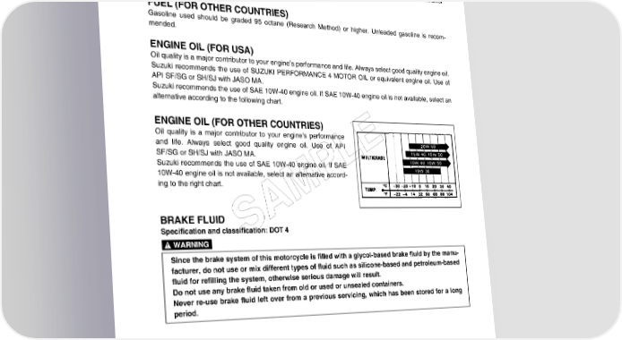 GENERAL INFORMATION 1-5 FUEL, OIL AND ENGINE COOLANT RECOMMENDATION FUEL (FOR USA AND CANADA) Use only unleaded gasoline of at least 90 pump octane (R/2 + M/2). Gasoline containing MTBE (Methyl Tertiary Butyl Ether), less than 10% ethanol, or less than 5% methanol with appropriate cosolvents and corrosion inhibitor is permissible. FUEL (FOR OTHER COUNTRIES) Gasoline used should be graded 95 octane (Research Method) or higher. Unleaded gasoline is recom- mended. ENGINE OIL (FOR USA) Oil quality is a major contributor to your engine’s performance and life. Always select good quality engine oil. Suzuki recommends the use of SUZUKI PERFORMANCE 4 MOTOR OIL or equivalent engine oil. Use of API SF/SG or SH/SJ with JASO MA. Suzuki recommends the use of SAE 10W-40 engine oil. If SAE 10W-40 engine oil is not available, select an alternative according to the following chart. ENGINE OIL (FOR OTHER COUNTRIES) Oil quality is a major contributor to your engine’s performance and life. Always select good quality engine oil. Use of API E SF/SG or SH/SJ with JASO MA. L Suzuki recommends the use of SAE 10W-40 engine oil. If SAE 10W-40 engine oil is not available, select an alternative accord- ing to the right chart. P M BRAKE FLUID A Specification and classification: DOT 4 S Since the brake system of this motorcycle is filled with a glycol-based brake fluid by the manu- facturer, do not use or mix different types of fluid such as silicone-based and petroleum-based fluid for refilling the system, otherwise serious damage will result. Do not use any brake fluid taken from old or used or unsealed containers. Never re-use brake fluid left over from a previous servicing, which has been stored for a long period.