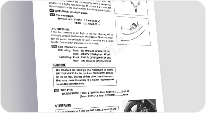 PERIODIC MAINTENANCE 2-27 TIRES Inspect every 6 000 km (4 000 miles, 12 months). TIRE TREAD CONDITION Operating the motorcycle with excessively worn tires will decrease riding stability and consequently invite a dangerous situation. It is highly recommended to replace a tire when the remaining depth of tire tread reaches the following specification. 09900-20805: Tire depth gauge Tire tread depth: Service Limit: FRONT : 1.6 mm (0.06 in) REAR : 2.0 mm (0.08 in) TIRE PRESSURE If the tire pressure is too high or too low, steering will be adversely affected and tire wear will increase. Therefore, main- tain the correct tire pressure for good roadability and a longer tire life. Cold inflation tire pressure is as follows. Cold inflation tire pressure E 2 Solo riding: Front: 250 kPa (2.50 kgf/cm , 36 psi) 2 Rear: 290 kPa (2.90 kgf/cm , 42 psi) L 2 Dual riding: Front: 250 kPa (2.50 kgf/cm , 36 psi) 2 P Rear: 290 kPa (2.90 kgf/cm , 42 psi) M The standard tire fitted on this motorcycle is 120/70 A ZR17 M/C (58 W) for the front and 190/50 ZR17 M/C (73 W) for the rear. The use of tires other than those spec- S ified may cause instability. It is highly recommended to use the specified tires. TIRE TYPE BRIDGESTONE (Front: BT014F SJ, Rear: BT014R J).........E-02, 19 (Front: BT014F J, Rear: BT014R E)...........Others STEERING Inspect initially at 1 000 km (600 miles, 2 months) and every 12 000 km (7 500 miles, 24 months) thereafter. The steering should be adjusted properly for smooth turning of the handlebars and safe operation. Overtighten steering pre- vents smooth turning of the handlebars and too loose steering will cause poor stability. Check that there is no play in the front fork. Support the motorcycle so that the front wheel is off the ground. With the wheel facing straight ahead, grasp the lower fork tubes near the axle and pull forward. If play is found, read- just the steering. (8-33)