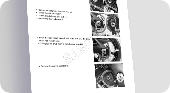 3-8 ENGINE • Remove the speed sensor rotor 4. • Remove the engine sprocket nut 5 and the washer 6. • Remove the cotter pin. (For E-03, 28, 33) • Loosen the rear axle nut 7. • Loosen the chain adjuster lock-nuts. • Loosen the chain adjusters 8. • Push the rear wheel forward and make sure that the drive E chain has enough slack. • Disengage the drive chain 9 from the rear sprocket. PL SAM • Remove the engine sprocket 0.