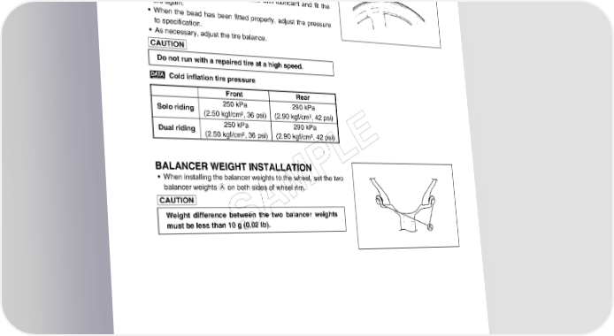 CHASSIS 8-85 • In this condition, check the “rim line” B cast on the tire side walls. The line must be equidistant from the wheel rim all around. If the distance between the rim line and wheel rim varies, this indicates that the bead is not properly seated. If this is the case, deflate the tire completely and unseat the bead for both sides. Coat the bead with lubricant and fit the tire again. • When the bead has been fitted properly, adjust the pressure to specification. • As necessary, adjust the tire balance. Do not run with a repaired tire at a high speed. Cold inflation tire pressure Front Rear Solo riding 250 kPa 290 kPa (2.50 kgf/cm², 36 psi) (2.90 kgf/cm², 42 psi) Dual riding 250 kPa 290 kPa (2.50 kgf/cm², 36 psi) (2.90 kgf/cm², 42 psi) E BALANCER WEIGHT INSTALLATION L P • When installing the balancer weights to the wheel, set the two balancer weights A on both sides of wheel rim. M Weight difference between the two balancer weights A must be less than 10 g (0.02 lb). S