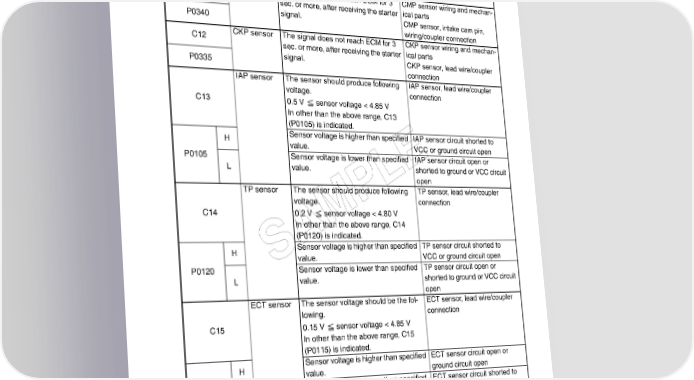 FI SYSTEM DIAGNOSIS 4-29 MALFUNCTION CODE AND DEFECTIVE CONDITION DTC No. DETECTED DETECTED FAILURE CONDITION CHECK FOR ITEM C00 NO FAULT ––––––––––– ––––––––––– C11 CMP sensor The signal does not reach ECM for 3 CMP sensor wiring and mechan- sec. or more, after receiving the starter ical parts P0340 signal. CMP sensor, intake cam pin, wiring/coupler connection C12 CKP sensor The signal does not reach ECM for 3 CKP sensor wiring and mechan- sec. or more, after receiving the starter ical parts P0335 signal. CKP sensor, lead wire/coupler connection IAP sensor The sensor should produce following IAP sensor, lead wire/coupler voltage. connection C13 0.5 V sensor voltage < 4.85 V In other than the above range, C13 (P0105) is indicated. H Sensor voltage is higher than specified IAP sensor circuit shorted to value. VCC or ground circuit open P0105 Sensor voltage is lower than specified IAP sensor circuit open or E L value. shorted to ground or VCC circuit Lopen TP sensor The sensor should produce following TP sensor, lead wire/coupler voltage. P connection C14 0.2 V sensor voltage < 4.80 V M In other than the above range, C14 (P0120) is indicated. A H Sensor voltage is higher than specified TP sensor circuit shorted to value. VCC or ground circuit open S P0120 Sensor voltage is lower than specified TP sensor circuit open or L value. shorted to ground or VCC circuit open ECT sensor The sensor voltage should be the fol- ECT sensor, lead wire/coupler lowing. connection C15 0.15 V sensor voltage < 4.85 V In other than the above range, C15 (P0115) is indicated. H Sensor voltage is higher than specified ECT sensor circuit open or P0115 value. ground circuit open L Sensor voltage is lower than specified ECT sensor circuit shorted to value. ground