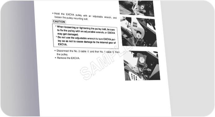 EXHAUST SYSTEM 6-5 • Remove the brake fluid reservoir tank mounting bolt 2 and front footrest bracket mounting bolts 3. • Move the front footrest assembly. • Hold the EXCVA pulley with an adjustable wrench, and loosen the pulley mounting bolt. * When loosening or tightening the pulley bolt, be sure to fix the pulley with an adjustable wrench, or EXCVA may get damaged. * Do not use the adjustable wrench to turn EXCVA pul- ley so as not to cause damage to the internal gear of EXCVA. E • Disconnect the No. 2 cable 4 and then No. 1 cable 5 from the pulley. L • Remove the EXCVA. P M A S