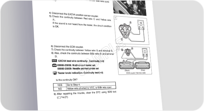 FI SYSTEM DIAGNOSIS 4-83 Step 1 (When indicating P1657-H:) 1 1) Turn the ignition switch OFF. 2) Lift and support the fuel tank. (5-3) 3) Check the EXCVA position sensor coupler for loose or poor contacts. If OK, then check the EXCVA position sensor lead wire conti- nuity. 4) Disconnect the EXCVA position sensor coupler. 1 5) Check the continuity between Red wire C and Yellow wire A. If the sound is not heard from the tester, the circuit condition is OK. 6) Disconnect the ECM coupler. 1 E 7) Check the continuity between Yellow wire A and terminal 5. ! L 8) Also, check the continuity between B/Br wire B and terminal S. P EXCVA lead wire continuity: Continuity () 09900-25008: Multi-circuit tester set M 09900-25009: Needle pointed probe set A (Black) (Gray) Tester knob indication: Continuity test () ECM coupler (Harness side) S Is the continuity OK? YES Go to Step 4. NO Yellow wire shorted to VCC, or B/Br wire open 9) After repairing the trouble, clear the DTC using SDS tool. (4-27)