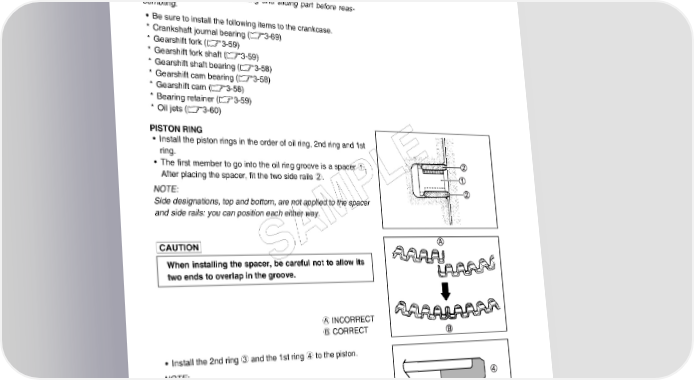 3-74 ENGINE ENGINE REASSEMBLY • Reassemble the engine in the reverse order of disassembly. • The following steps require special attention or precautionary measures should be taken. NOTE: Apply engine oil to each running and sliding part before reas- sembling. • Be sure to install the following items to the crankcase. * Crankshaft journal bearing (3-69) * Gearshift fork (3-59) * Gearshift fork shaft (3-59) * Gearshift shaft bearing (3-58) * Gearshift cam bearing (3-58) * Gearshift cam (3-58) * Bearing retainer (3-59) * Oil jets (3-60) PISTON RING • Install the piston rings in the order of oil ring, 2nd ring and 1st ring. • The first member to go into the oil ring groove is a spacer 1. E After placing the spacer, fit the two side rails 2. L NOTE: P Side designations, top and bottom, are not applied to the spacer and side rails: you can position each either way. M A S When installing the spacer, be careful not to allow its two ends to overlap in the groove. A INCORRECT B CORRECT • Install the 2nd ring 3 and the 1st ring 4 to the piston. NOTE: 1st ring and 2nd ring differ in shape.