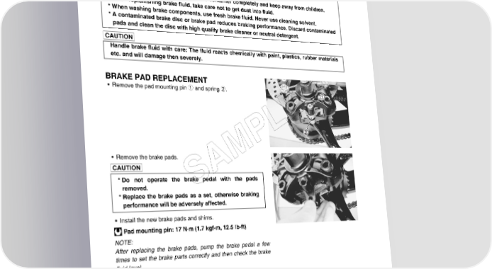 8-74 CHASSIS * This brake system is filled with an ethylene glycol-based DOT 4 brake fluid. Do not use mix different types of fluid such as silicone-based or petroleum-based. * Do not use any brake fluid taken from old, used or unsealed containers. Never reuse brake fluid left over from the last servicing or stored for long periods. * When storing the brake fluid, seal the container completely and keep away from children. * When replenishing brake fluid, take care not to get dust into fluid. * When washing brake components, use fresh brake fluid. Never use cleaning solvent. * A contaminated brake disc or brake pad reduces braking performance. Discard contaminated pads and clean the disc with high quality brake cleaner or neutral detergent. Handle brake fluid with care: The fluid reacts chemically with paint, plastics, rubber materials etc. and will damage then severely. BRAKE PAD REPLACEMENT • Remove the pad mounting pin 1 and spring 2. E L P • Remove the brake pads. M A * Do not operate the brake pedal with the pads removed. S * Replace the brake pads as a set, otherwise braking performance will be adversely affected. • Install the new brake pads and shims. Pad mounting pin: 17 N·m (1.7 kgf-m, 12.5 lb-ft) NOTE: After replacing the brake pads, pump the brake pedal a few times to set the brake parts correctly and then check the brake fluid level.