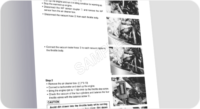 5-26 FUEL SYSTEM AND THROTTLE BODY THROTTLE VALVE SYNCHRONIZATION Check and adjust the throttle valve synchronization among four cylinders. USE OF DIGITAL VACUUM TESTER Step 1 • Lift and support the fuel tank. (5-3) • Start up the engine and run it in idling condition for warming up. • Stop the warmed-up engine. • Disconnect the IAP sensor coupler 1 and remove the IAP sensor from the air cleaner box. • Disconnect the vacuum hose 2 from each throttle body. • Connect the vacuum tester hose 3 to each vacuum nipple on E the throttle body. L P M A S Step 2 • Remove the air cleaner box. (5-13) • Connect a tachometer and start up the engine. • Bring the engine rpm to 1 150 r/min by the throttle stop screw. • Check the vacuum of the four cylinders and balance the four throttle valves with the balance screw 4. Avoid dirt drawn into the throttle body while running the engine without air cleaner box cover. Dirt drawn into the engine will damage the internal engine parts. NOTE: * During balancing the throttle valves, always set the engine rpm at 1 150 r/min, using throttle stop screw. * After balancing the four valves, set the idle rpm to 1 150 r/min by the throttle stop screw. * If the above procedures cannot still synchronize the valves, proceed to the next step.