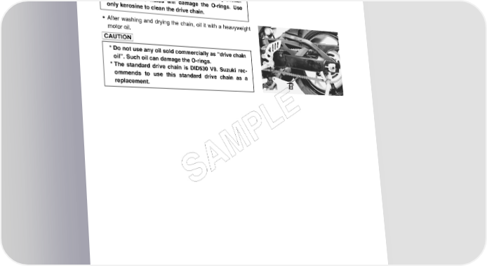 2-22 PERIODIC MAINTENANCE CLEANING AND LUBRICATING • Clean the drive chain with kerosine. If the drive chain tends to rust quickly, the intervals must be shortened. Do not use trichloroethylene, gasoline or any similar solvent. These fluids will damage the O-rings. Use only kerosine to clean the drive chain. • After washing and drying the chain, oil it with a heavyweight motor oil. * Do not use any oil sold commercially as “drive chain oil”. Such oil can damage the O-rings. * The standard drive chain is DID530 V9. Suzuki rec- ommends to use this standard drive chain as a replacement. E L P M A S