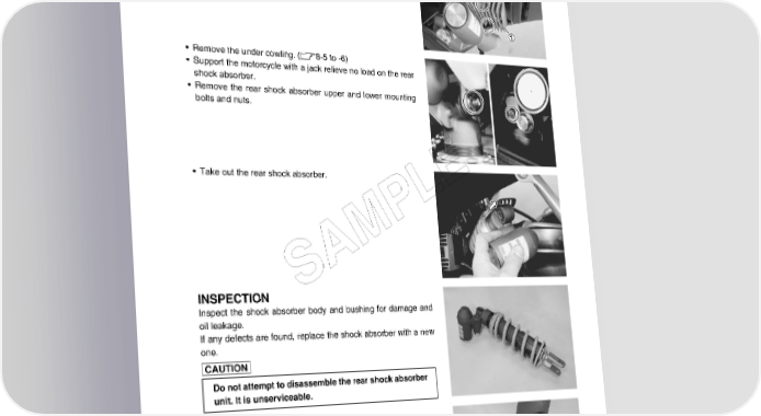 CHASSIS 8-49 REMOVAL • Lift and support the fuel tank with the fuel tank prop stay. (5-3) • Remove the regulator/rectifier 1. (10-40) • Remove the under cowling. (8-5 to -6) • Support the motorcycle with a jack relieve no load on the rear shock absorber. • Remove the rear shock absorber upper and lower mounting bolts and nuts. • Take out the rear shock absorber. E L P M A INSPECTION S Inspect the shock absorber body and bushing for damage and oil leakage. If any defects are found, replace the shock absorber with a new one. Do not attempt to disassemble the rear shock absorber unit. It is unserviceable.