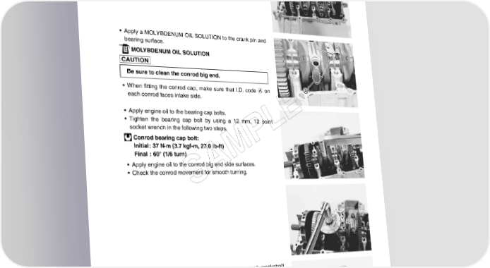 ENGINE 3-77 • Set the crankshaft to the conrods and upper crankcase. • Apply a MOLYBDENUM OIL SOLUTION to the crank pin and bearing surface. MOLYBDENUM OIL SOLUTION Be sure to clean the conrod big end. • When fitting the conrod cap, make sure that I.D. code A on each conrod faces intake side. • Apply engine oil to the bearing cap bolts. E • Tighten the bearing cap bolt by using a 12 mm, 12 point socket wrench in the following two steps. L Conrod bearing cap bolt: P Initial: 37 N·m (3.7 kgf-m, 27.0 lb-ft) Final : 60° (1/6 turn) M • Apply engine oil to the conrod big end side surfaces. A • Check the conrod movement for smooth turning. S 60˚ • Apply a MOLYBDENUM OIL SOLUTION to each crankshaft journal and bearing lightly. MOLYBDENUM OIL SOLUTION