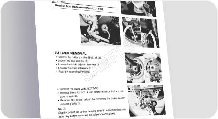 CHASSIS 8-75 BRAKE FLUID REPLACEMENT • Remove the brake fluid reservoir cap 1. • Replace the brake fluid in the same manner as the front brake. (8-64) Specification and classification: DOT 4 Bleed air from the brake system. (2-26) CALIPER REMOVAL E • Remove the cotter pin. (For E-03, 28, 33) L • Loosen the rear axle nut 1. P • Loosen the chain adjuster lock-nuts 2. • Loosen the chain adjusters 3. M • Push the rear wheel forward. A S • Remove the brake pads. (8-74) • Remove the union bolt 4 and catch the brake fluid in a suit- able receptacle. • Remove the brake caliper by removing the brake caliper mounting bolts 5. NOTE: Slightly loosen the caliper housing bolts 6 to facilitate later dis- assembly before removing the caliper mounting bolts. Never reuse the brake fluid left over from previous servicing and stored for long periods. Brake fluid, if it leaks, will interfere with safe running and discolor painted surfaces. Check the brake hose and hose joints for cracks and fluid leakage.