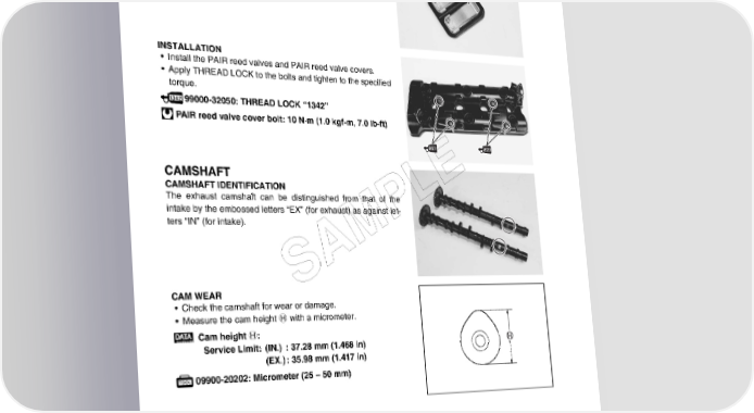 3-28 ENGINE INSPECTION • Inspect the reed valve for the carbon deposit. • If the carbon deposit is found in the reed valve, replace the PAIR reed valve with a new one. INSTALLATION • Install the PAIR reed valves and PAIR reed valve covers. • Apply THREAD LOCK to the bolts and tighten to the specified torque. 99000-32050: THREAD LOCK “1342” PAIR reed valve cover bolt: 10 N·m (1.0 kgf-m, 7.0 lb-ft) CAMSHAFT E CAMSHAFT IDENTIFICATION The exhaust camshaft can be distinguished from that of the L intake by the embossed letters “EX” (for exhaust) as against let- ters “IN” (for intake). P M A CAM WEAR S • Check the camshaft for wear or damage. • Measure the cam height H with a micrometer. Cam height H: Service Limit: (IN.) : 37.28 mm (1.468 in) (EX.): 35.98 mm (1.417 in) 09900-20202: Micrometer (25 – 50 mm)