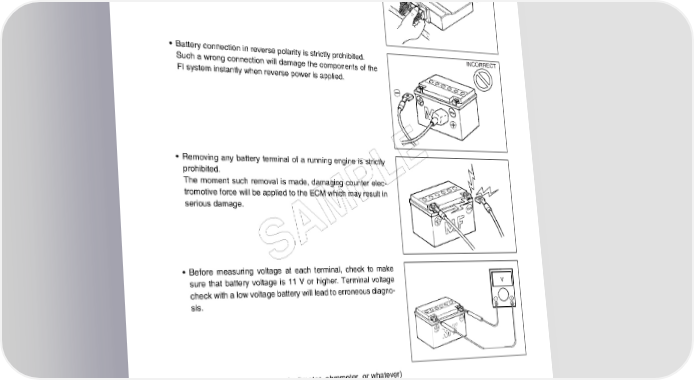 FI SYSTEM DIAGNOSIS 4-5 • When disconnecting and connecting the ECM, make sure to turn OFF the ignition switch 1, or electronic parts may get damaged. • Battery connection in reverse polarity is strictly prohibited. INCORRECT Such a wrong connection will damage the components of the FI system instantly when reverse power is applied. • Removing any battery terminal of a running engine is strictly E prohibited. The moment such removal is made, damaging counter elec- L tromotive force will be applied to the ECM which may result in serious damage. P SAM • Before measuring voltage at each terminal, check to make sure that battery voltage is 11 V or higher. Terminal voltage check with a low voltage battery will lead to erroneous diagno- sis. • Never connect any tester (voltmeter, ohmmeter, or whatever) to the ECM when its coupler is disconnected. Otherwise, damage to ECM may result. • Never connect an ohmmeter to the ECM with its coupler con- nected. If attempted, damage to ECM or sensors may result. • Be sure to use a specified voltmeter/ohmmeter. Otherwise, accurate measurements may not be obtained and personal injury may result.