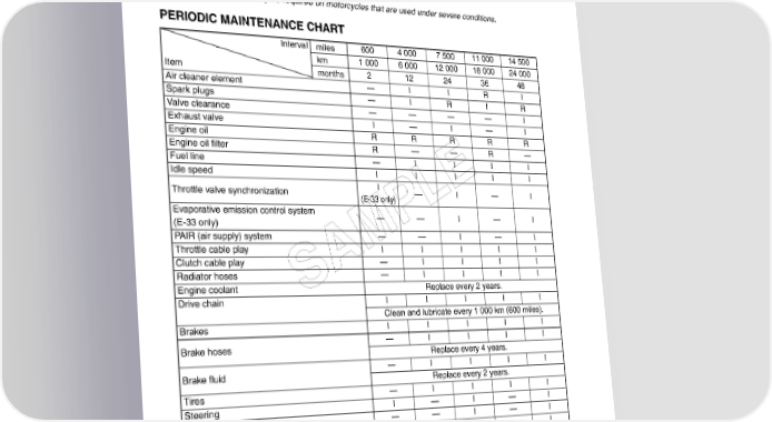 2-2 PERIODIC MAINTENANCE PERIODIC MAINTENANCE SCHEDULE The chart below lists the recommended intervals for all the required periodic service work necessary to keep the motorcycle operating at peak performance and economy. Mileages are expressed in terms of kilome- ters, miles and time for your convenience. NOTE: More frequent servicing may be required on motorcycles that are used under severe conditions. PERIODIC MAINTENANCE CHART Interval miles 600 4 000 7 500 11 000 14 500 km 1 000 6 000 12 000 18 000 24 000 Item months 212243648 Air cleaner element ---- I I R I Spark plugs ---- I R I R Valve clearance ---- ---- ---- ---- I Exhaust valve I ---- I ---- I Engine oil R R R R R Engine oil filter R ---- ---- R ---- Fuel line ---- I I I I Idle speed IIIII I E Throttle valve synchronization (E-33 only) ---- I ---- I Evaporative emission control system L ---- ---- I ---- I (E-33 only) P PAIR (air supply) system ---- ---- I ---- I M Throttle cable play IIIII Clutch cable play ---- I I I I A Radiator hoses ---- I I I I Engine coolant Replace every 2 years. S Drive chain I I I I I Clean and lubricate every 1 000 km (600 miles). Brakes IIIII Brake hoses ---- I I I I Replace every 4 years. Brake fluid ---- I I I I Replace every 2 years. Tires ----IIII Steering I ---- I ---- I Front forks ---- ---- I ---- I Rear suspension ---- ---- I ---- I Exhaust pipe bolts and muffler bolt and nut T ---- T ---- T Chassis bolts and nuts T TTTT NOTE: I = Inspect and clean, adjust, replace or lubricate as necessary R = Replace T = Tighten