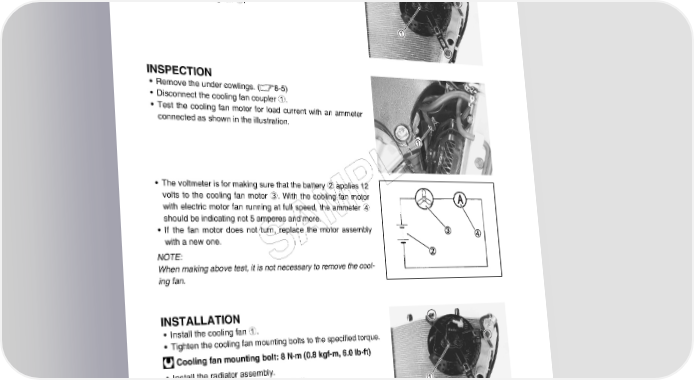 7-6 COOLING AND LUBRICATION SYSTEM COOLING FAN REMOVAL • Remove the under cowlings. (8-5) • Drain the engine coolant. (2-17) • Remove the radiator assembly. (3-5) • Remove the cooling fan 1. INSPECTION • Remove the under cowlings. (8-5) • Disconnect the cooling fan coupler 1. • Test the cooling fan motor for load current with an ammeter connected as shown in the illustration. E • The voltmeter is for making sure that the battery 2 applies 12 L volts to the cooling fan motor 3. With the cooling fan motor P with electric motor fan running at full speed, the ammeter 4 should be indicating not 5 amperes and more. M • If the fan motor does not turn, replace the motor assembly with a new one. A NOTE: S When making above test, it is not necessary to remove the cool- ing fan. INSTALLATION • Install the cooling fan 1. • Tighten the cooling fan mounting bolts to the specified torque. Cooling fan mounting bolt: 8 N·m (0.8 kgf-m, 6.0 lb-ft) • Install the radiator assembly. • Route the radiator hoses. (10-24) • Pour engine coolant. (2-17) • Bleed the air from the cooling circuit. (2-18) • Install the under cowlings. (8-6)