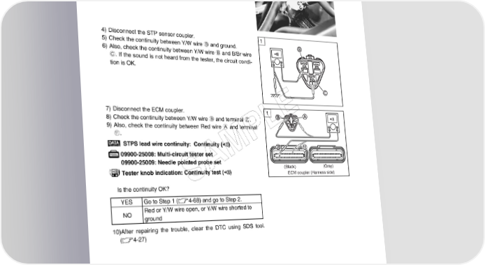 4-70 FI SYSTEM DIAGNOSIS Step 1 (When indicating P1654-L:) 1 1) Turn the ignition switch OFF. 2) Lift and support the fuel tank. (5-3) 3) Check the STP sensor coupler for loose or poor contacts. If OK, then check the STP sensor lead wire continuity. 4) Disconnect the STP sensor coupler. 1 5) Check the continuity between Y/W wire B and ground. 6) Also, check the continuity between Y/W wire B and B/Br wire C. If the sound is not heard from the tester, the circuit condi- tion is OK. 7) Disconnect the ECM coupler. 1 E ! 8) Check the continuity between Y/W wire B and terminal J. 9) Also, check the continuity between Red wire A and terminal L A. P STPS lead wire continuity: Continuity () 09900-25008: Multi-circuit tester set M 09900-25009: Needle pointed probe set A (Black) (Gray) Tester knob indication: Continuity test () ECM coupler (Harness side) Is the continuity OK? S YES Go to Step 1 (4-68) and go to Step 2. NO Red or Y/W wire open, or Y/W wire shorted to ground 10)After repairing the trouble, clear the DTC using SDS tool. (4-27)