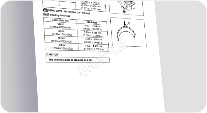 3-68 ENGINE Crank pin O.D. Code O.D. specification 1 34.992 – 35.000 mm (1.3776 – 1.3780 in) 2 34.984 – 34.992 mm (1.3773 – 1.3776 in) 3 34.976 – 34.984 mm (1.3770 – 1.3773 in) 09900-20202: Micrometer (25 – 50 mm) Bearing thickness Color (Part No.) Thickness Green 1.480 – 1.484 mm (12164-41G00-0A0) (0.0583 – 0.0584 in) Black 1.484 – 1.488 mm (12164-41G00-0B0) (0.0584 – 0.0586 in) Brown 1.488 – 1.492 mm (12164-41G00-0C0) (0.0586 – 0.0587 in) Yellow 1.492 – 1.496 mm (12164-41G00-0D0) (0.0587 – 0.0589 in) E L The bearings must be replaced as a set. P M A S