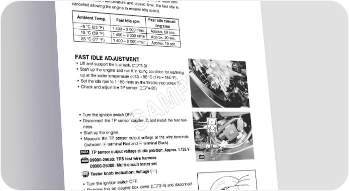 5-24 FUEL SYSTEM AND THROTTLE BODY FAST IDLE The fast idle system is automatic type. When the fast idle cam is turned by the secondary throttle valve actuator, the cam pushes the lever on the throttle valve shaft causing the throttle valve to open and raise the engine speed. When the engine has warmed up, depending on the water tem- perature, ambient temperature and lapsed time, the fast idle is cancelled allowing the engine to resume idle speed. Ambient Temp. Fast idle rpm Fast idle cancel- ling time –5 °C (23 °F) 1 400 – 2 000 r/min Approx. 60 sec. 15 °C (59 °F) 1 400 – 2 000 r/min Approx. 20 sec. 25 °C (77 °F) 1 400 – 2 000 r/min Approx. 10 sec. FAST IDLE ADJUSTMENT • Lift and support the fuel tank. (5-3) • Start up the engine and run it in idling condition for warming up at the water temperature of 80 – 90 °C (176 – 194 °F). • Set the idle rpm to 1 150 r/min by the throttle stop screw 1. E • Check and adjust the TP sensor. (4-20) PL • Turn the ignition switch OFF. M • Disconnect the TP sensor coupler 2 and install the test har- ness. SA V • Start up the engine. • Measure the TP sensor output voltage at the wire terminals (between + terminal Red and - terminal Black). TP sensor output voltage at idle position: Approx. 1.125 V 09900-28630: TPS test wire harness 09900-25008: Multi-circuit tester set Tester knob indication: Voltage () • Turn the ignition switch OFF. • Remove the air cleaner box cover (2-4) and disconnect the STVA coupler. (5-14) • Turn the ignition switch ON. • Open the secondary throttle valve fully by turning it with your finger. • With the secondary throttle valve held at this position, mea- sure the output voltage of the TP sensor as shown.