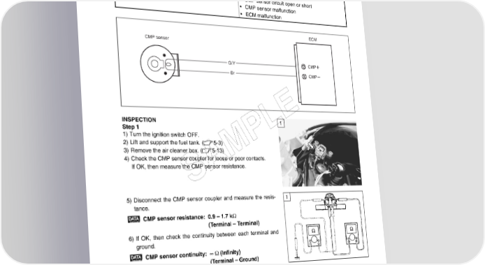 FI SYSTEM DIAGNOSIS 4-33 “C11” (P0340) CMP SENSOR CIRCUIT MALFUNCTION DETECTED CONDITION POSSIBLE CAUSE The signal does not reach ECM for 3 sec. or more, • Metal particles or foreign material being stuck on after receiving the starter signal. the CMP sensor and rotor tip • CMP sensor circuit open or short • CMP sensor malfunction • ECM malfunction ECM CMP sensor G/Y CMP Br CMP INSPECTION 1 E Step 1 L 1) Turn the ignition switch OFF. P 2) Lift and support the fuel tank. (5-3) 3) Remove the air cleaner box. (5-13) M 4) Check the CMP sensor coupler for loose or poor contacts. If OK, then measure the CMP sensor resistance. SA 5) Disconnect the CMP sensor coupler and measure the resis- 1 tance. CMP sensor resistance: 0.9 – 1.7 kΩ (Terminal – Terminal) 6) If OK, then check the continuity between each terminal and ground. CMP sensor continuity: ∞ Ω (Infinity) (Terminal – Ground) 09900-25008: Multi-circuit tester set Tester knob indication: Resistance (Ω) Are the resistance and continuity OK? YES Go to step 2. NO Replace the CMP sensor with a new one. 7) After repairing the trouble, clear the DTC using SDS tool. (4-27)