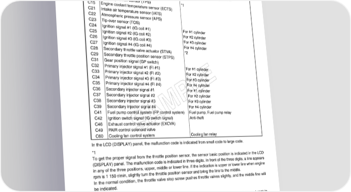 FI SYSTEM DIAGNOSIS 4-19 CODE MALFUNCTION PART REMARKS C00 None No defective part C11 Camshaft position sensor (CMPS) C12 Crankshaft position sensor (CKPS) Pick-up coil signal, signal generator C13 Intake air pressure sensor (IAPS) C14 Throttle position sensor (TPS) *1 C15 Engine coolant temperature sensor (ECTS) C21 Intake air temperature sensor (IATS) C22 Atmospheric pressure sensor (APS) C23 Tip-over sensor (TOS) C24 Ignition signal #1 (IG coil #1) For #1 cylinder C25 Ignition signal #2 (IG coil #2) For #2 cylinder C26 Ignition signal #3 (IG coil #3) For #3 cylinder C27 Ignition signal #4 (IG coil #4) For #4 cylinder C28 Secondary throttle valve actuator (STVA) *2 C29 Secondary throttle position sensor (STPS) C31 Gear position signal (GP switch) C32 Primary injector signal #1 (FI #1) For #1 cylinder C33 Primary injector signal #2 (FI #2) For #2 cylinder C34 Primary injector signal #3 (FI #3) For #3 cylinder E C35 Primary injector signal #4 (FI #4) For #4 cylinder C36 Secondary injector signal #1 For #1 cylinder L C37 Secondary injector signal #2 For #2 cylinder C38 Secondary injector signal #3 For #3 cylinder P C39 Secondary injector signal #4 For #4 cylinder C41 Fuel pump control system (FP control system) Fuel pump, Fuel pump relay M C42 Ignition switch signal (IG switch signal) Anti-theft A C46 Exhaust control valve actuator (EXCVA) C49 PAIR control solenoid valve S Cooling fan relay C60 Cooling fan control system In the LCD (DISPLAY) panel, the malfunction code is indicated from small code to large code. *1 To get the proper signal from the throttle position sensor, the sensor basic position is indicated in the LCD (DISPLAY) panel. The malfunction code is indicated in three digits. In front of the three digits, a line appears in any of the three positions, upper, middle or lower line. If the indication is upper or lower line when engine rpm is 1 150 r/min, slightly turn the throttle position sensor and bring the line to the middle. In the normal condition, the throttle valve stop screw pushes throttle valves slightly, and the middle line will be indicated. *2 When the secondary throttle valve actuator and secondary throttle position sensor signals are not sent to ECM. In this case, C28 and C29 are indicated alternately.