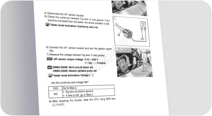 4-54 FI SYSTEM DIAGNOSIS Step 1 (When indicating P0110-L:) 1 1) Turn the ignition switch OFF. 2) Lift and support the fuel tank. (5-3) 3) Check the IAT sensor coupler for loose or poor contacts. If OK, then check the IAT sensor lead wire continuity. 4) Disconnect the IAT sensor coupler. 1 5) Check the continuity between Dg wire A and ground. If the sound is not heard from the tester, the circuit condition is OK. Tester knob indication: Continuity test () 6) Connect the IAT sensor coupler and turn the ignition switch 1 E ON. 7) Measure the voltage between Dg wire A and ground. L V IAT sensor output voltage: 0.15 – 4.85 V P (+ Dg – - Ground) 09900-25008: Multi-circuit tester set M 09900-25009: Needle pointed probe set A Tester knob indication: Voltage () S Are the continuity and voltage OK? YES Go to Step 2. NO • Dg wire shorted to ground • If wire is OK, go to Step 2. 8) After repairing the trouble, clear the DTC using SDS tool. (4-27)