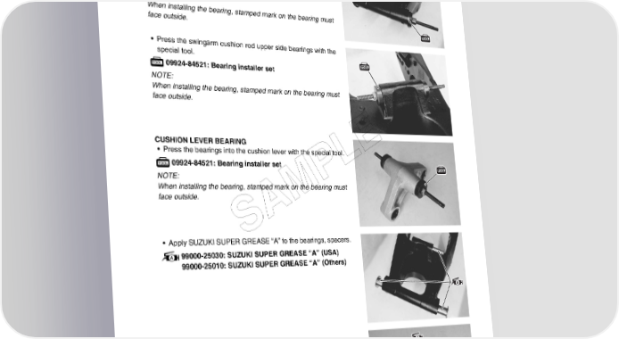 CHASSIS 8-59 SWINGARM BEARING • Install the center spacer. • Press the bearings into the swingarm pivot with the special tool. 09941-34513: Steering race installer NOTE: When installing the bearing, stamped mark on the bearing must face outside. • Press the swingarm cushion rod upper side bearings with the special tool. 09924-84521: Bearing installer set NOTE: When installing the bearing, stamped mark on the bearing must face outside. CUSHION LEVER BEARING E • Press the bearings into the cushion lever with the special tool. 09924-84521: Bearing installer set L NOTE: P When installing the bearing, stamped mark on the bearing must face outside. M A S • Apply SUZUKI SUPER GREASE “A” to the bearings, spacers. 99000-25030: SUZUKI SUPER GREASE “A” (USA) 99000-25010: SUZUKI SUPER GREASE “A” (Others)