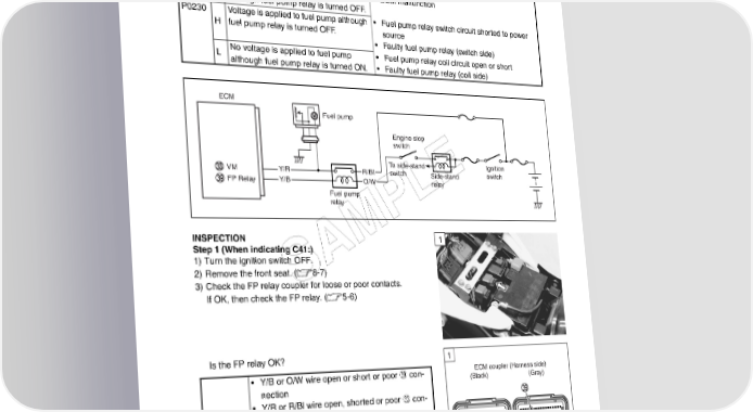 FI SYSTEM DIAGNOSIS 4-79 “C41” (P0230-H/L) FP RELAY CIRCUIT MALFUNCTION DETECTED CONDITION POSSIBLE CAUSE C41 No voltage is applied to fuel pump • Fuel pump relay circuit open or short although fuel pump relay is turned ON, • Fuel pump relay malfunction or voltage is applied to fuel pump, • ECM malfunction although fuel pump relay is turned OFF. P0230 Voltage is applied to fuel pump although • Fuel pump relay switch circuit shorted to power H fuel pump relay is turned OFF. source • Faulty fuel pump relay (switch side) L No voltage is applied to fuel pump • Fuel pump relay coil circuit open or short although fuel pump relay is turned ON. • Faulty fuel pump relay (coil side) ECM M Fuel pump Engine stop switch To side-stand Ignition VM Y/R R/BI switch Side-stand switch FP Relay Y/B O/W E relay Fuel pump L relay P INSPECTION M 1 Step 1 (When indicating C41:) 1) Turn the ignition switch OFF. A 2) Remove the front seat. (8-7) S 3) Check the FP relay coupler for loose or poor contacts. If OK, then check the FP relay. (5-6) Is the FP relay OK? 1 • Y/B or O/W wire open or short or poor ] con- ECM coupler (Harness side) nection (Black) (Gray) • Y/R or R/Bl wire open, shorted or poor W con- nection YES • If wire and connection are OK, intermittent trou- ble or faulty ECM. • Recheck each terminal and wire harness for open circuit and poor connection. • Replace the ECM with a known good one, and inspect it again. NO Replace the FP relay with a new one.