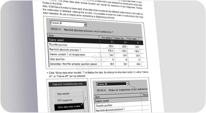 4-28 FI SYSTEM DIAGNOSIS SHOW DATA WHEN TROUBLE (DISPLAING DATA AT THE TIME OF DTC) ECM stores the engine and driving conditions (in the form of data as shown in the figure) at the moment of the detection of a malfunction in its memory. This data is called “Show data when trouble”. Therefore, it is possible to know engine and driving conditions (e.g., whether the engine was warm or not, where the motorcycle was running or stopped) when a malfunction was detected by checking the show data when trouble. This show data when trouble function can record the maximum of two Diagnostic Trouble Codes in the ECM. Also, ECM has a function to store each show data when trouble for two different malfunctions in the order as the malfunction is detected. Utilizing this function, it is possible to know the order of malfunctions that have been detected. Its use is helpful when rechecking or diagnosing a trouble. E L P M A • Click “Show data when trouble” 1 to display the data. By clicking the drop down button 2, either “Failure #1” or “Failure #2” can be selected. S