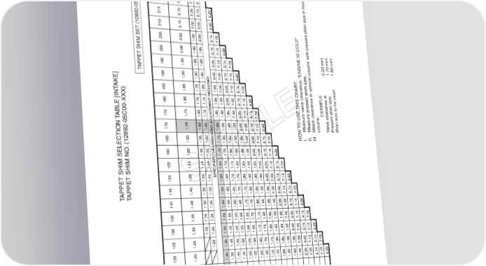 2-10 PERIODIC MAINTENANCE (INTAKE SIDE) ontal iz 220 2.20 2.102.15 e in hor 215 2.15 2.052.102.20 210 2.10 2.002.052.20 205 2.05 1.952.002.152.20 200 2.00 1.901.952.102.152.20 APPET SHIM SET (12800-05830)1951.951.851.902.052.102.152.20 0.23 mm1.70 mm1.80 mm T “ENGINE IS COLD”. e 190 : . 1.90 1.801.852.002.052.102.152.20 T tical column with present shim siz AKE] UIRED anceer 185 1.85 1.751.801.952.002.052.102.152.20 CHAR e 180 e clear 1.80 1.701.751.901.952.002.052.102.152.20 alv ance in vance is EXAMPLEe to be used ABLE [INT 175 1.75 1.651.701.851.901.952.002.052.102.152.20E T USE THIS e clear O alv 170 1.70 1.601.651.801.851.901.952.002.052.102.152.20L W T Measure vMeasure present shim sizMatch clearcolumn.VPresent shim sizShim siz 165 P HOI. II. III. (12892-05C00-XXX) 1.65 1.551.601.751.801.851.901.952.002.052.102.152.20 . 160 1.60 1.501.551.701.751.801.851.901.952.002.052.102.152.20 M 155 1.55 1.451.501.651.701.751.801.851.901.952.002.052.102.152.20 A SPECIFIED CLEARANCE/NO ADJUSTMENT REQ 150 1.50 1.401.451.601.651.701.751.801.851.901.952.002.052.102.152.20 S APPET SHIM SELECTION APPET SHIM NO1451.451.351.401.551.601.651.701.751.801.851.901.952.002.052.102.152.20 T T 140 1.40 1.301.351.501.551.601.651.701.751.801.851.901.952.002.052.102.152.20 135 1.35 1.251.301.451.501.551.601.651.701.751.801.851.901.952.002.052.102.152.20 130 1.30 1.201.251.401.451.501.551.601.651.701.751.801.851.901.952.002.052.102.152.20 125 1.25 1.201.351.401.451.501.551.601.651.701.751.801.851.901.952.002.052.102.152.20 120 1.20 1.301.351.401.451.501.551.601.651.701.751.801.851.901.952.002.052.102.152.20 . NO (mm) SUFFIXPRESENTSHIM SIZE 0.00 – 0.040.05 – 0.090.10 – 0.200.21 – 0.250.26 – 0.300.31 – 0.350.36 – 0.400.41 – 0.450.46 – 0.500.51 – 0.550.56 – 0.600.61 – 0.650.66 – 0.700.71 – 0.750.76 – 0.800.81 – 0.850.86 – 0.900.91 – 0.950.96 – 1.001.01 – 1.051.06 – 1.101.11 – 1.15 VE AL MEASURED VCLEARANCE (mm)
