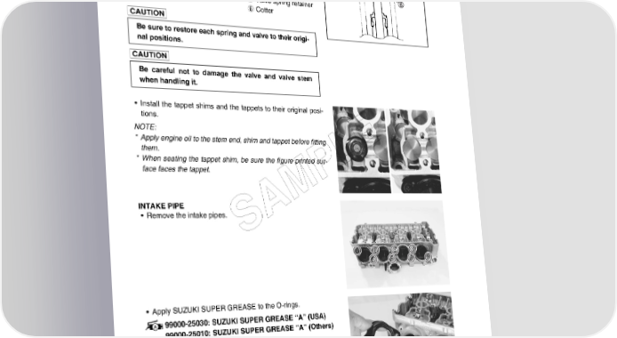 3-42 ENGINE • Be sure that the rounded lip E of the cotter fits snugly into the groove F in the stem end. • Install the other valves and springs in the same manner as described previously. 5 Valve spring retainer 6 Cotter Be sure to restore each spring and valve to their origi- nal positions. Be careful not to damage the valve and valve stem when handling it. • Install the tappet shims and the tappets to their original posi- tions. NOTE: * Apply engine oil to the stem end, shim and tappet before fitting E them. * When seating the tappet shim, be sure the figure printed sur- L face faces the tappet. P INTAKE PIPE M • Remove the intake pipes. A S • Apply SUZUKI SUPER GREASE to the O-rings. 99000-25030: SUZUKI SUPER GREASE “A” (USA) 99000-25010: SUZUKI SUPER GREASE “A” (Others) • Install the intake pipes.